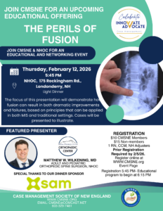 Thursday, February 12, 2026 – 5:45 PM – NHOC, Londonderry, NH – Perils of Fusion $10 CMSNE member, $15 Non-member. 1 RN, CCM and NH Adjuster’s Credit. Register Online Here. Download Flyer. Sponsored by SAM and NHOC