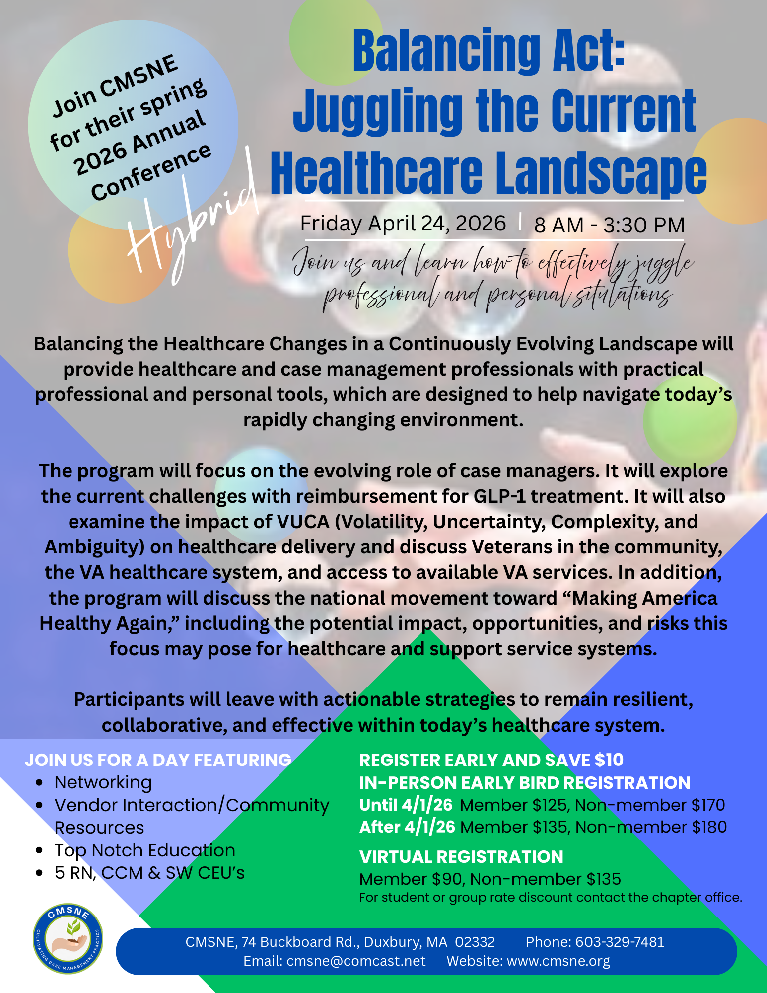 Saturday February 7, 2026 – 2026 CMSNE Virtual Acute Hospital Case Management Conference – Essential Guide to Healthcare Changes and the Challenger in 2026: Strategies and Solutions from National Experts – Registration Now Open Learn more here.