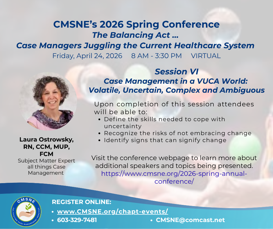 The Case Management Society of New England (CMSNE), is the New England Chapter of the Case Management Society of America (CMSA), a multidisciplinary, interdisciplinary network of healthcare professionals working in the specialized practice of CaseManagement. Our Chapter members hail from Massachusetts, Rhode Island, Conneticut, Maine, New Hampshire & Vermont.